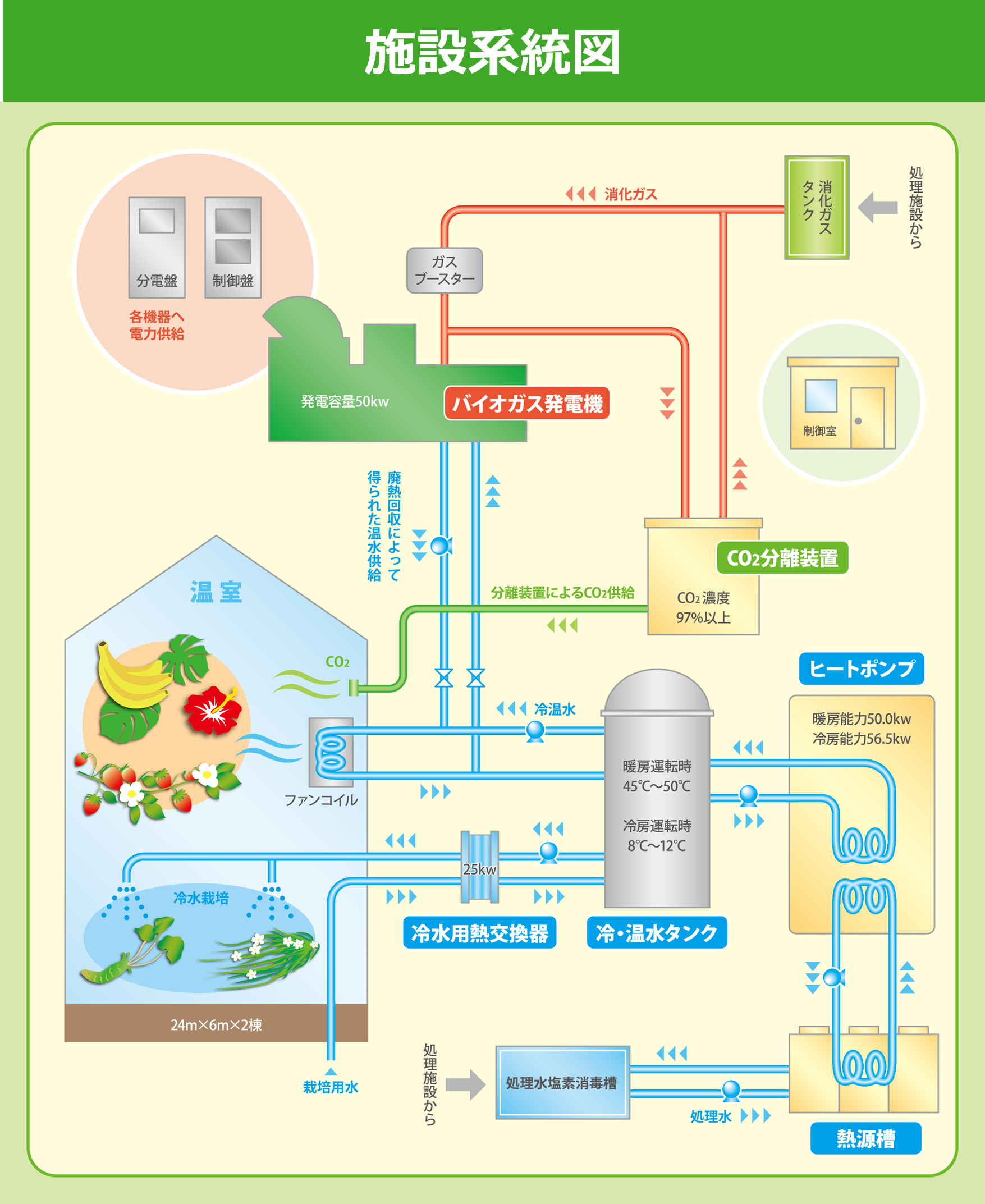 2. バイオガス発電機によるシステムへの電力供給と排熱・排ガスを用いた熱・CO2供給システム