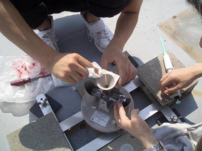 年長の修士2年草場大作と修士1年伊藤梓は、雨量計の水平や制御盤を確認。